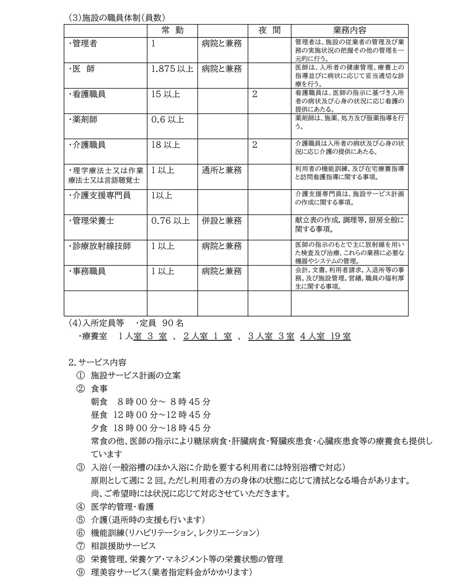 療養室の定員は4人以下でパーテーションを常設する等、入居者のプライバシー空間に配慮し、長期療養に相応しい施設となっています。また、談話室、食堂、レクリエーション・ルーム、機能訓練室などが設けられています。