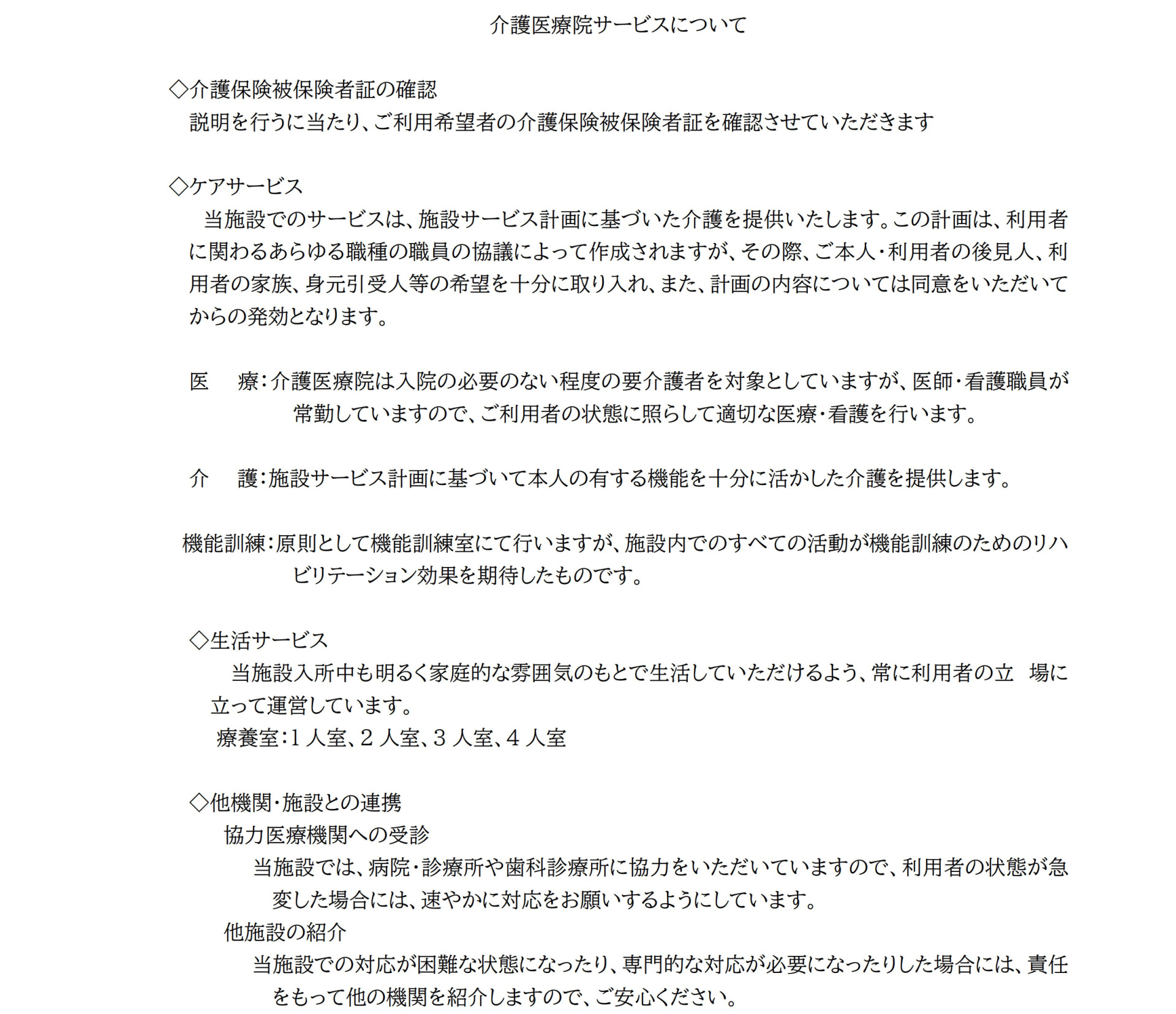 日常生活に必要な医療処置や看護、介護、リハビリテーション等を提供し、入居者の方の能力に応じたサービスを提供します。